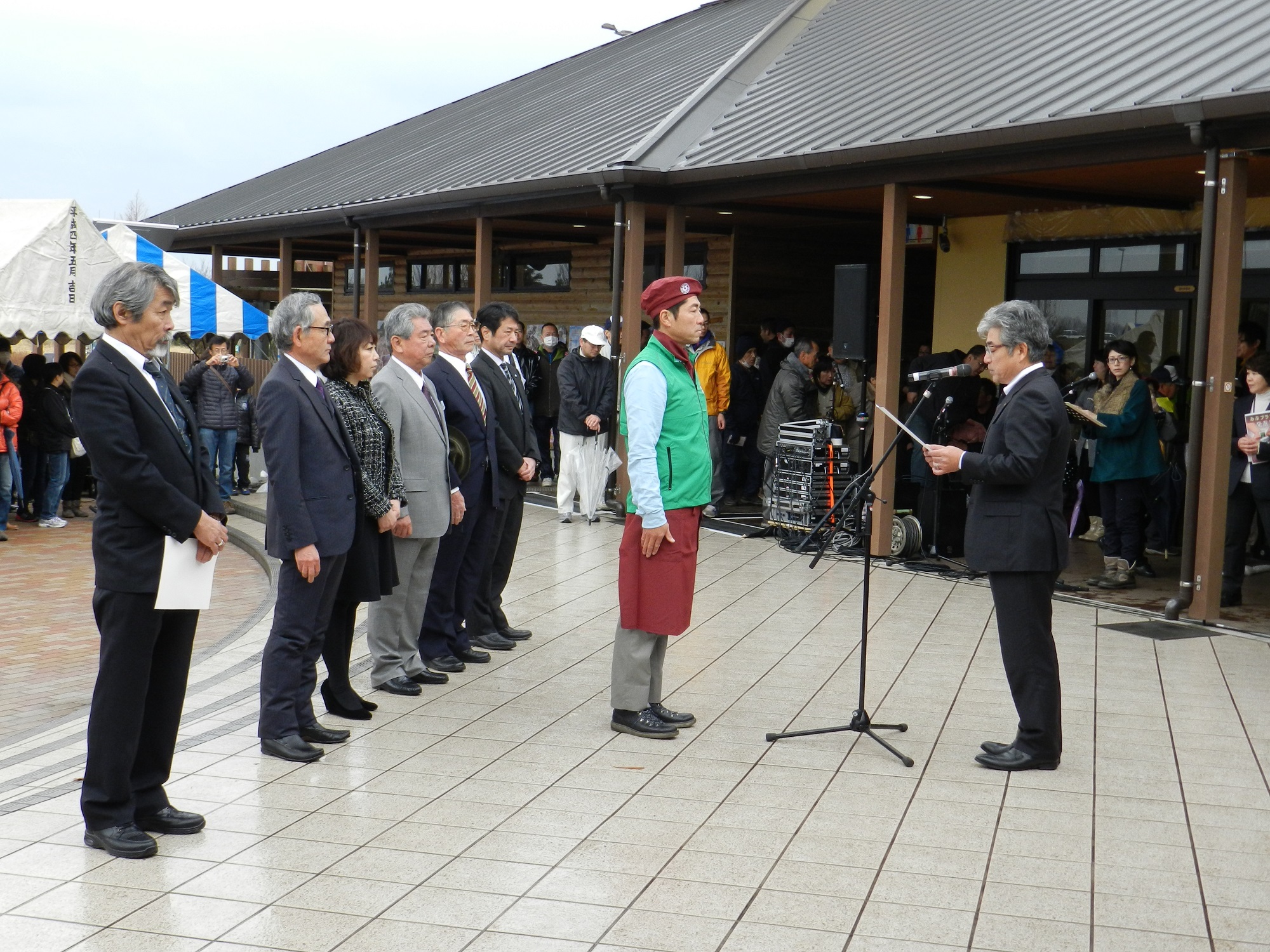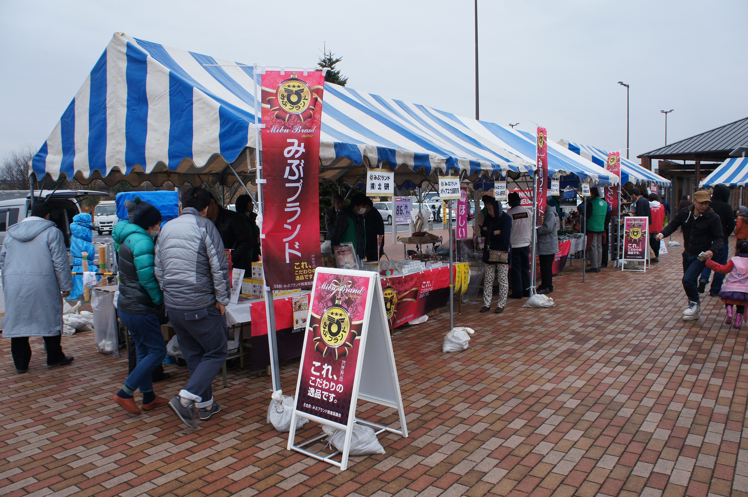 H26 認定証授与式 2015/03/06 3月1日(日)みぶハイウェーパークを会場に実施したみぶの日フェアで、2月1日に初めて認定された「みぶブランド」、7社10品の認定証授与式が挙行されました。 当日は、傘の花が咲く生憎の天気となりましたが、ブランド認定品販売と販売ユニホームのお披露目も重なり、それぞれのお店に町内外の人が訪れ、商品の話題や地域のことなど、会話の花も沢山咲く一日となりました。