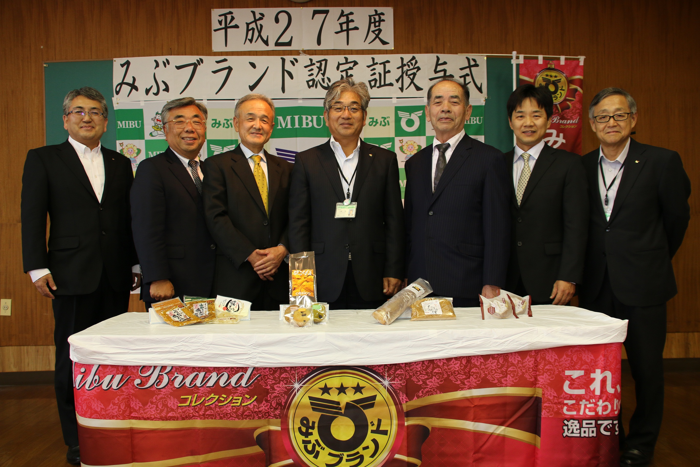 H27 認定証授与式 2015/10/21 平成27年度 みぶブランド認定 10月15日(木)役場正庁で、平成27年度みぶブランド認定証授与式が行われ、4社8品が認定となりました。 授与式には、各社の代表者たちが出席し小菅一弥町長から認定証が手渡されました。