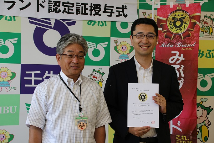 株式会社 すが野 2016/09/07 ○専務取締役 菅野 様のことば 『ごはんにかけるごぼうと昆布』は、第1回「全国漬物グランプリ」金賞受賞の㈱すが野のおススメする新しい商品です。 壬生町をPRする商品として申し分ないものですので、「みぶブランド」に申請させていただきました。また㈱すが野の商品は、平成27年度にも3品認定いただいています。「みぶブランド」認定事業者として、これからも益々の壬生町の発展にご協力できればと思っています。 ありがとうございました。