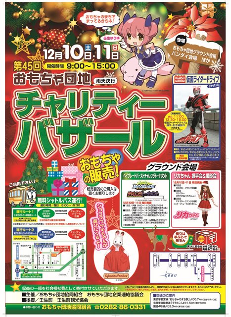 2016.12.10-11第45回おもちゃ団地チャリティーバザールにて販売! 2016/12/02 2016.12.10(土)-11(日)第45回おもちゃ団地チャリティーバザールにて、壬生町観光協会テントで販売します。 おもちゃ団地グラウンド会場・入口付近です。 おもちゃ購入後は、「みぶブランド」をお土産にどうぞ。