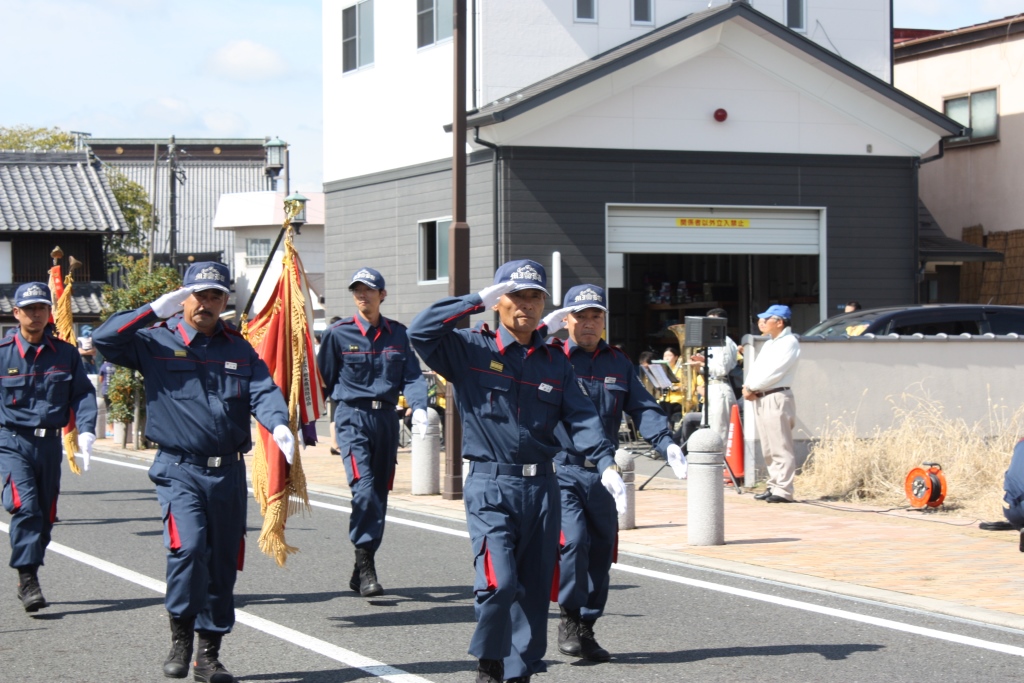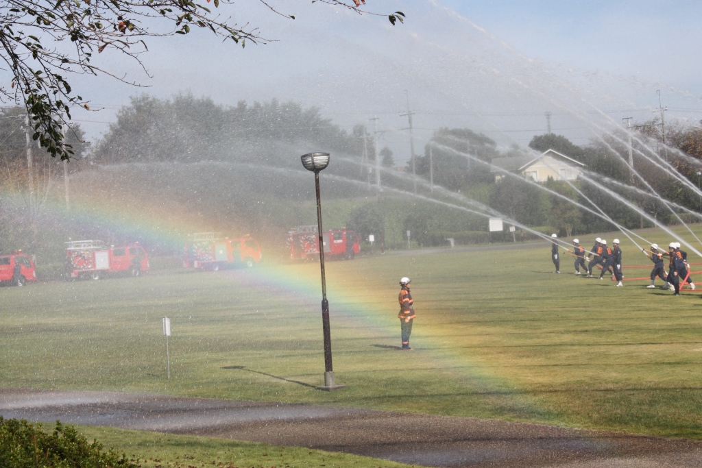 消防関係殉職者に対し黙祷を捧げた後、多数の御来賓臨席のもと、人員点検及び全団員の服装点検、全分団による機械器具点検、ポンプ車による操法点検に続き、放水点検を行い、有事の際に最善の行動が取れるように万全の体制を整えました。