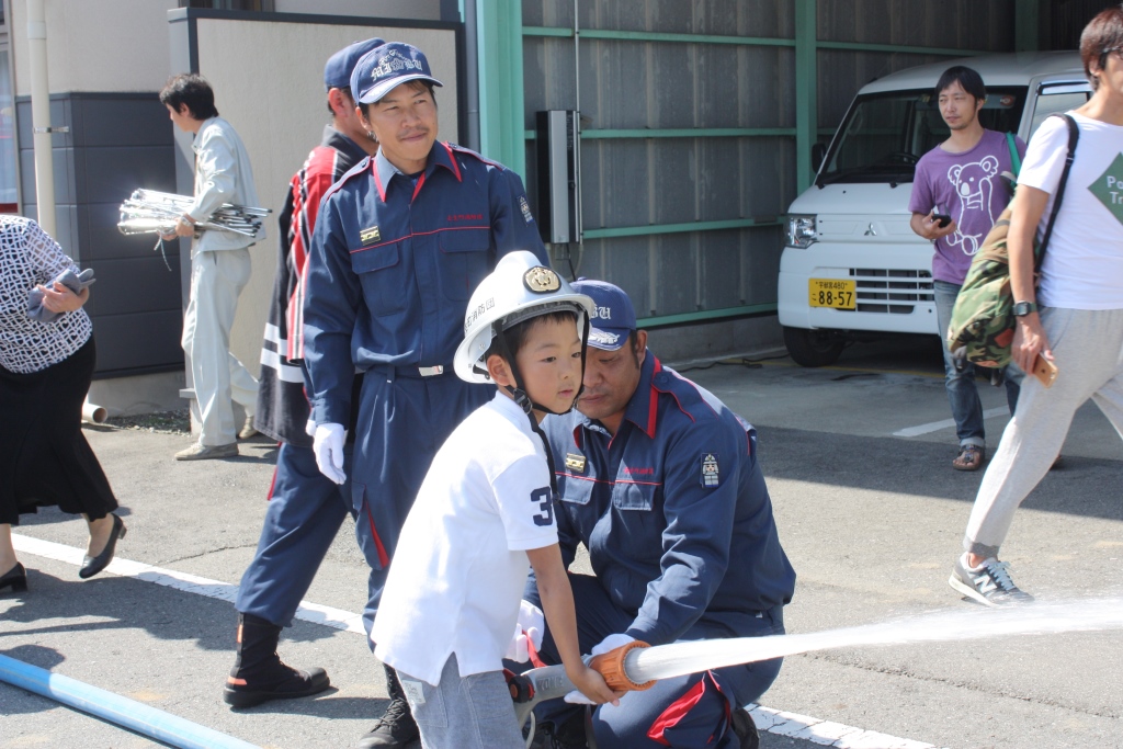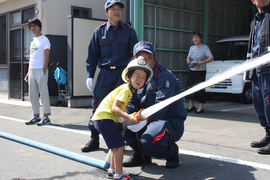 また、通常点検後は蘭学通りにおいて、多くの人が見守る中、消防団本部役員、消防団員、消防団車両、石橋地区消防組合消防車両等による分列行進が行われました。また、分列行進後には役場駐車場において、消防車両の展示や、放水体験ができる消防フェアが行なわれ、たくさんの家族連れでにぎわいました。