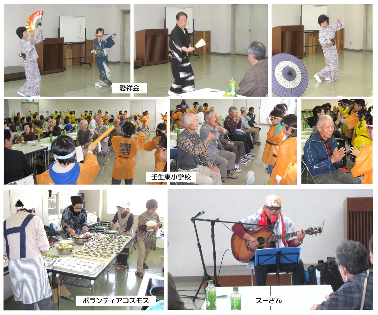 11月2日、「落合地区お達者サロンクラブ」で、恒例の円遊会が行われました。最初に「愛祥会」の奥ゆかしい「新舞踊」が披露され、そのあと壬生東小学校の児童が入場。歌やリコーダー演奏、論語唱和など、日頃の練習の成果を発表しました。