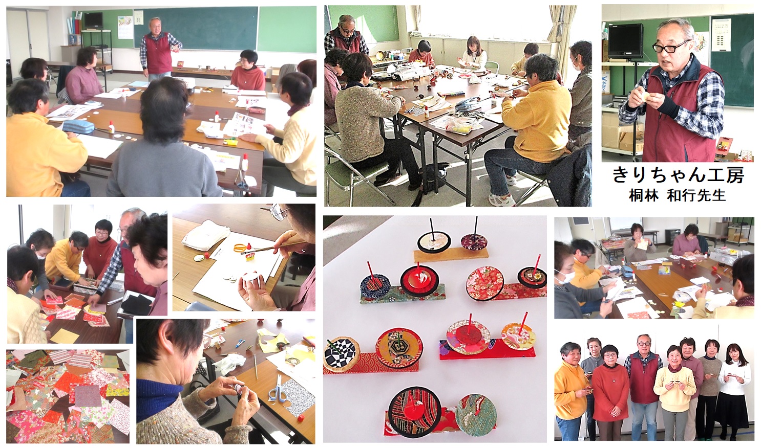 和紙で作る「飾りコマ」作り体験を開催しました。 2018/03/13 2月3日、みぶりんイベント「和紙で作る「飾りコマ」作り体験」を開催いたしました。 「きりちゃん工房」の桐林先生と奥様の丁寧な指導で、参加者は楽しく飾りコマ体験をしました。