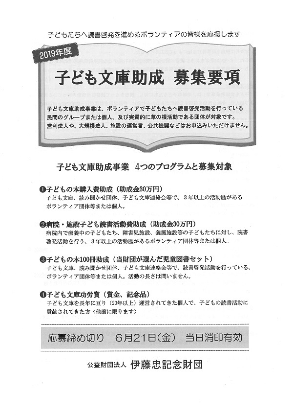 公益財団法人伊藤忠記念財団「子ども文庫助成」贈呈先候補募集につきまして、お知らせいたします。