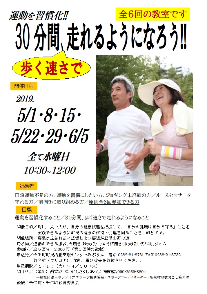 「30分間歩く速さで走れるようになろう!」に参加しませんか。 2019/04/18 壬生町地域おこし協力隊の西堂路淳さんからのお知らせです。 PDFはこちら。(PDF:448KB) 30分間歩く速さで走れるようになろう!