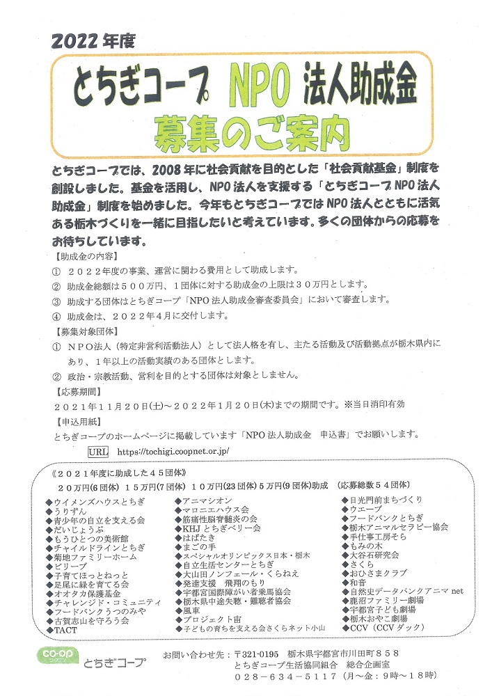 とちぎコープNPO法人助成金募集のご案内