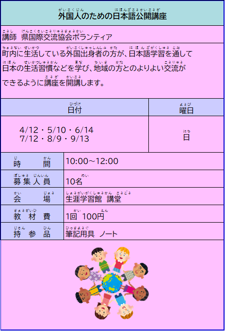 令和8年度前期 外国人のための日本語公開講座 参加者募集 2026/04/01 当日参加募集!! とうじつ さんか ぼしゅう!! お申込みは不要です。気軽に参加してください。 きがるに さんか してください♪